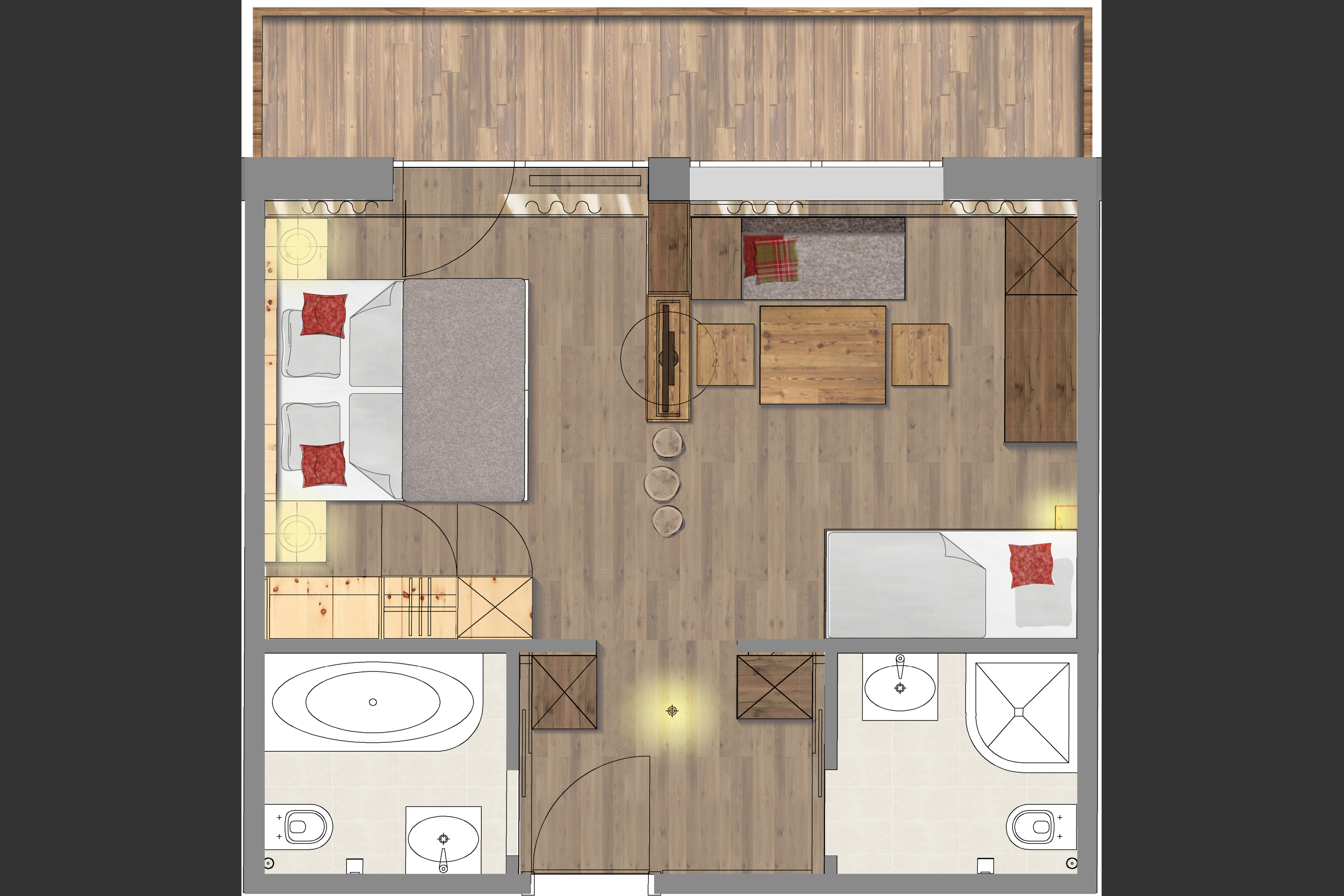 This category is usually booked by families with children. The rooms are equipped with a double bed and a high-quality bunk bed, so up to 4 people can stay in this room category, with an extra bed also a 5th person.