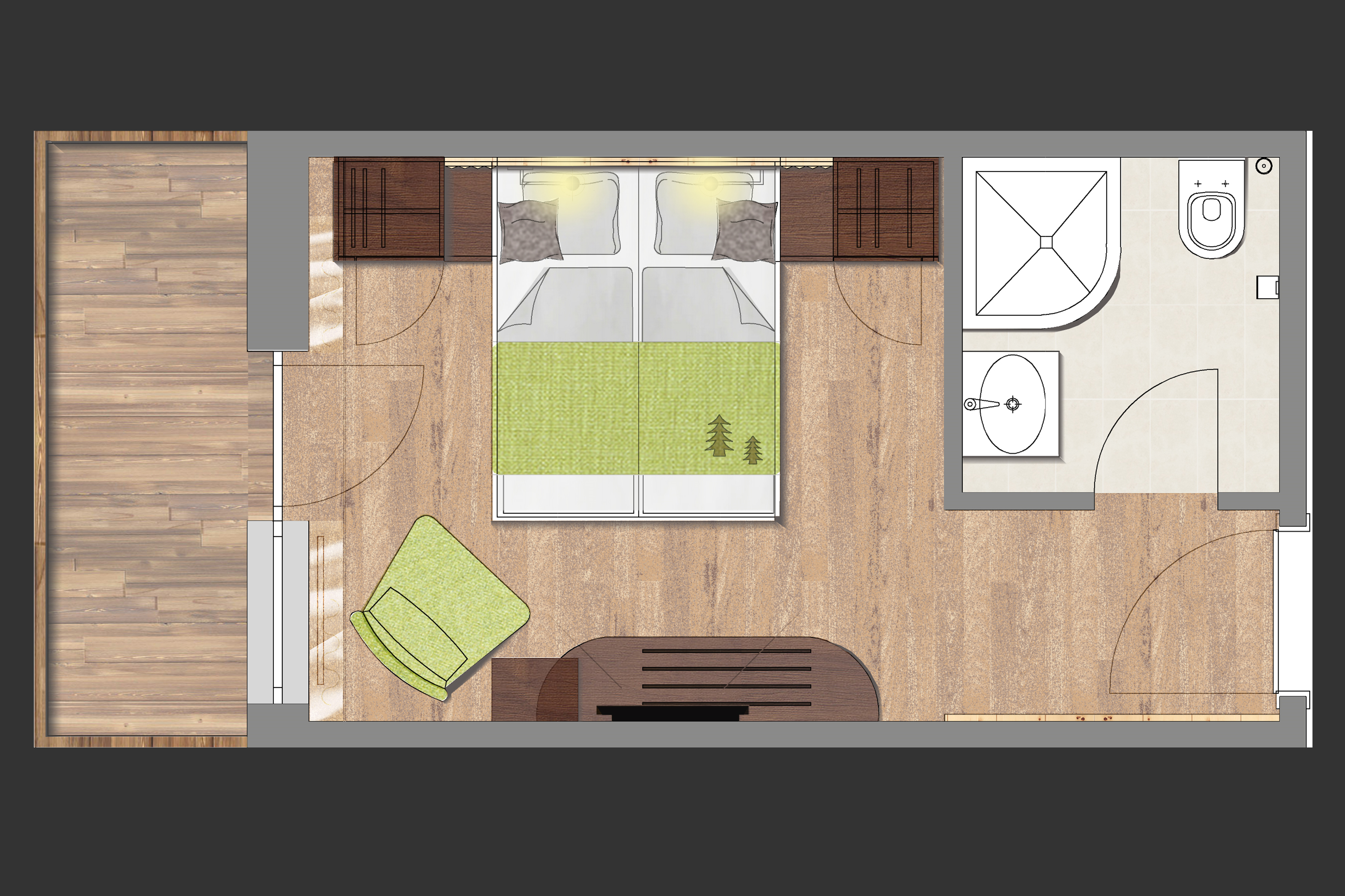 This room is usually booked as a single room, but with its queen-size bed (160x200cm) can also be used as a children's room for two older children or by young couples and is the most favourable way for 2 people to stay with us at the Berghotel Hochfügen.